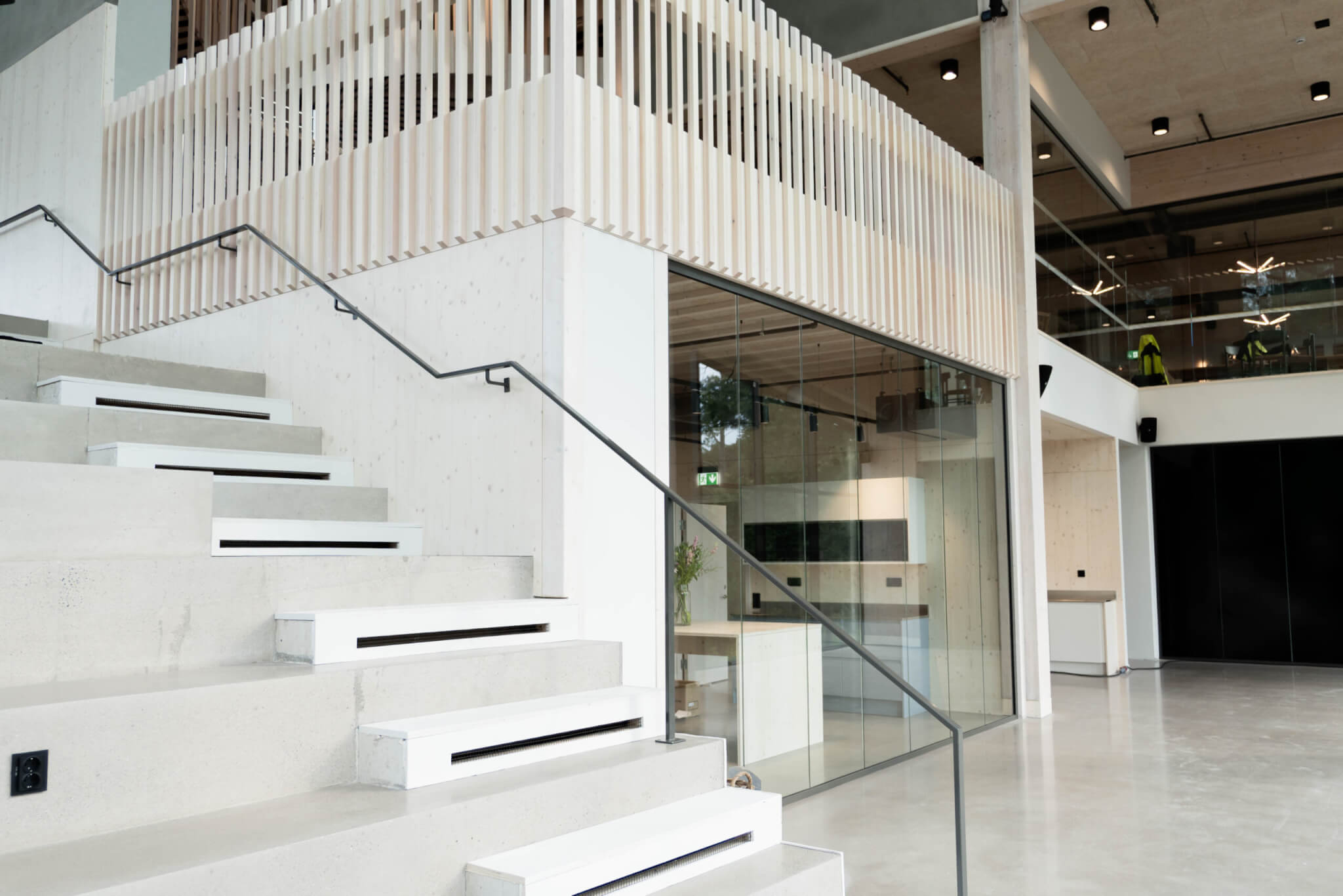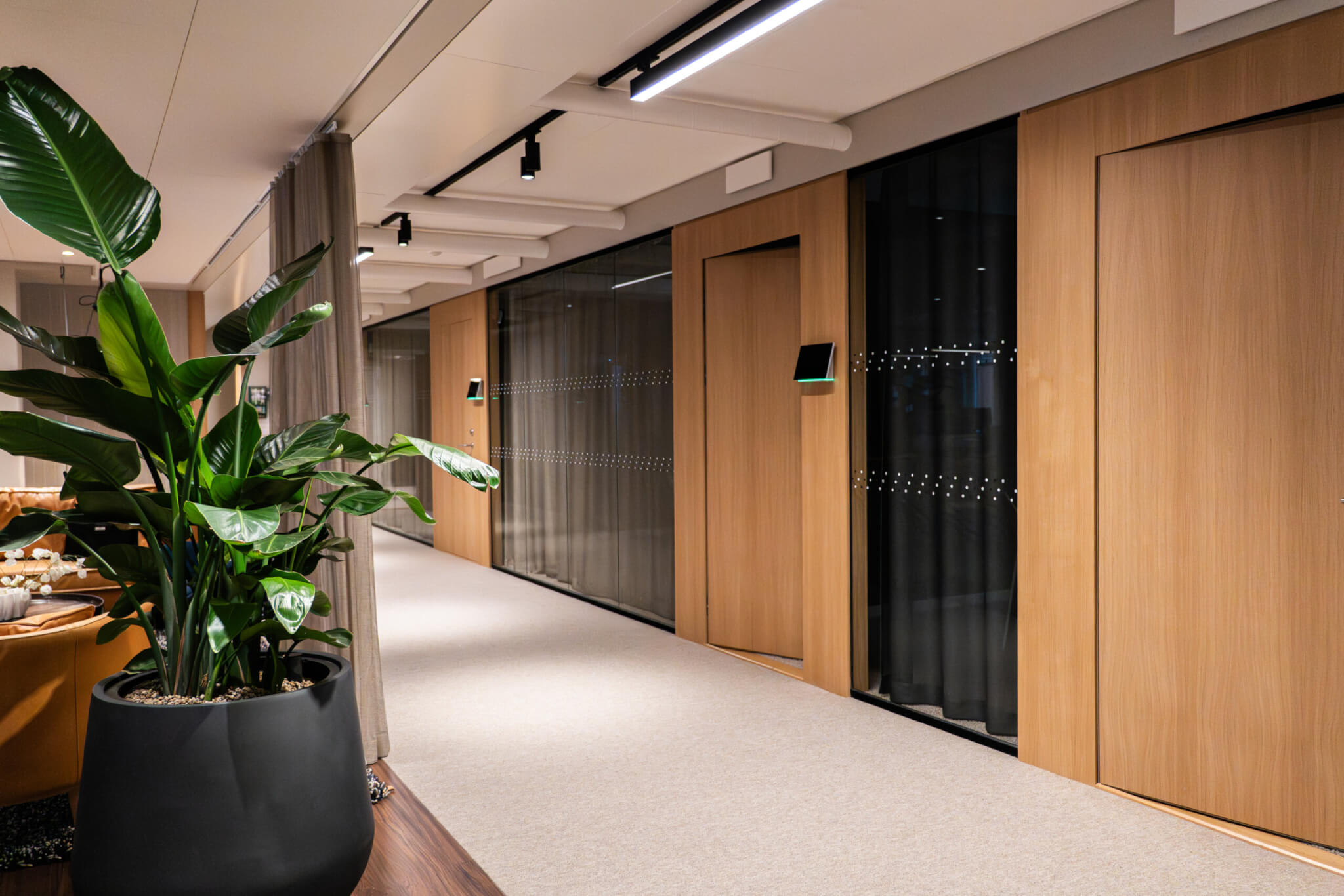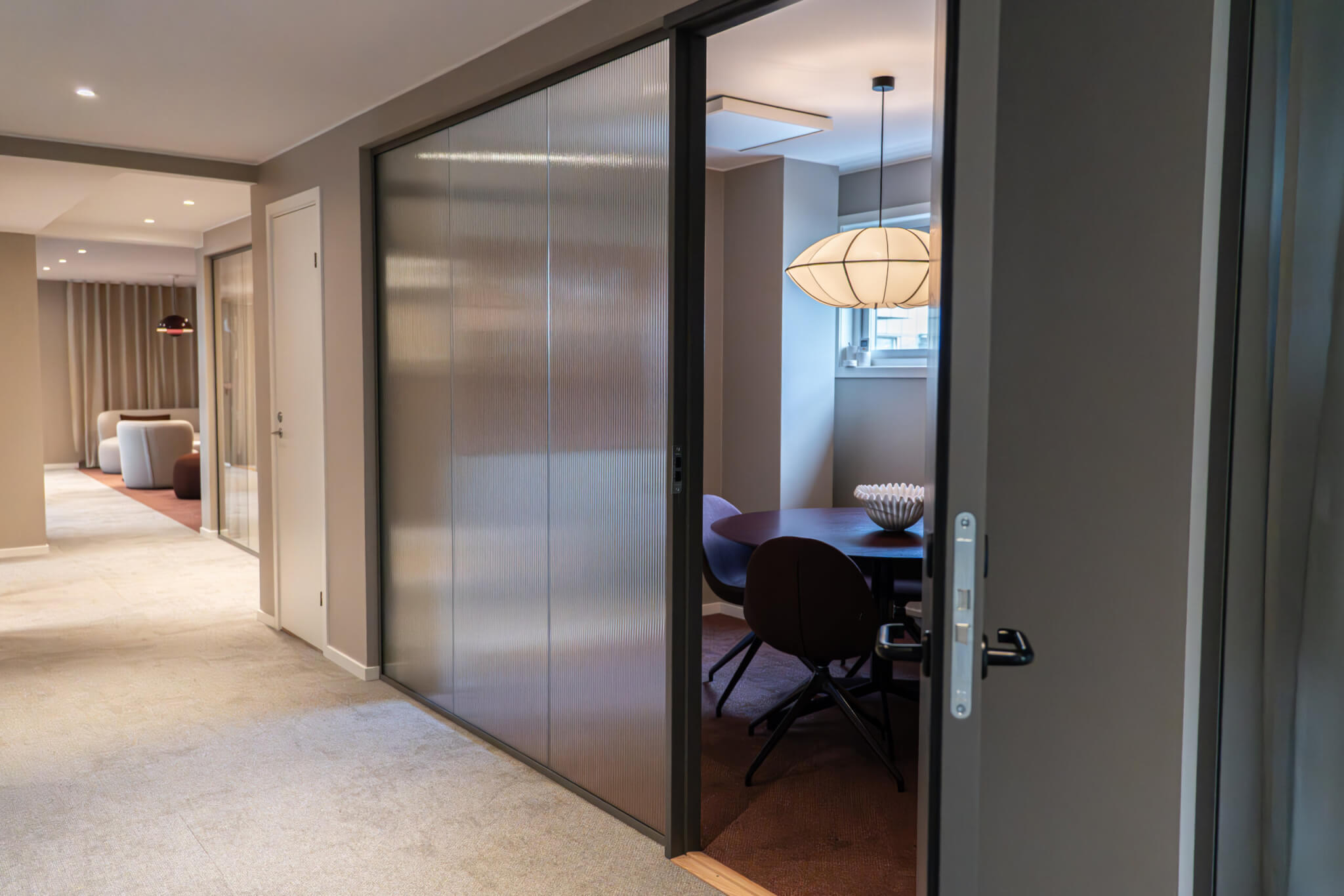 Glasvägg DEKO FG kännetecknas av en stilren design som ger maximalt med ljusinsläpp och en inkluderande känsla. Glasen sammanfogas diskret mot varandra med en tunn transparent tejt och monteras i naturanodiserade aluminiumprofiler. Profilerna ansluter mot golv, tak och vägg samt mot tillhörande vald dörrlösning. Aluminiumprofilerna går att lacka i valfri RAL kulör för att få ett annat uttryck och design.