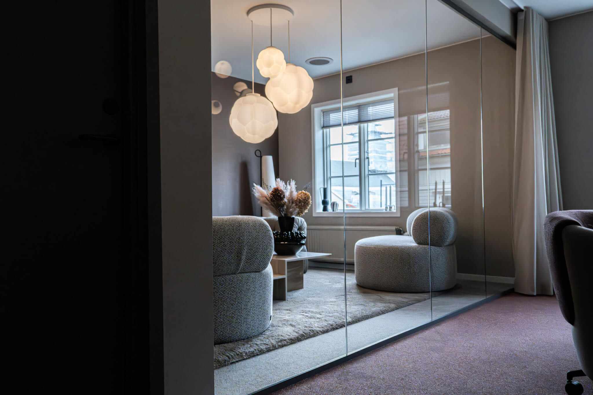 Glasvägg DEKO FG kännetecknas av en stilren design som ger maximalt med ljusinsläpp och en inkluderande känsla. Glasen sammanfogas diskret mot varandra med en tunn transparent tejp och monteras i naturanodiserade aluminiumprofiler. Profilerna ansluter mot golv, tak och vägg samt mot tillhörande vald dörrlösning. Aluminiumprofilerna går att lacka i valfri RAL kulör för att få ett annat uttryck och design.